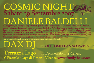 Venerdì 27 Luglio 2007 PERAROCK: COSMIC SOUND*Avremo l'onore di presentarvi il Cosmic Sound direttamente dalle mani dell'indiscusso padre dei dj italiani: